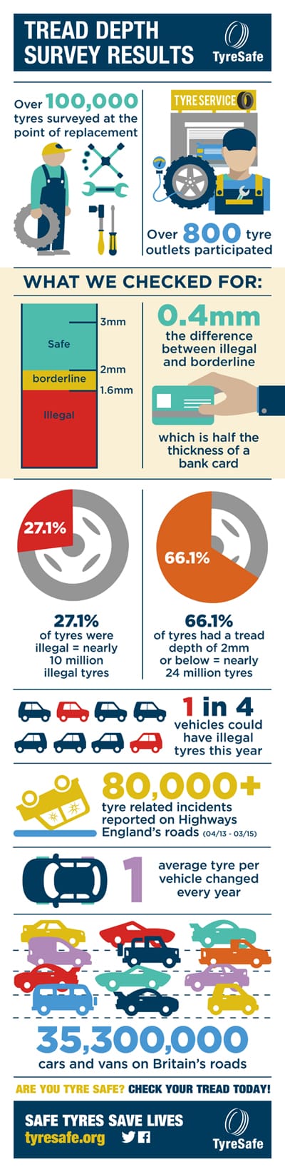 TyreSafe's survey found that more than 27% of people replaced their tyres when they were already illegal, that could mean over 10 million illegal and dangerous tyres on Britain's roads in 2016.